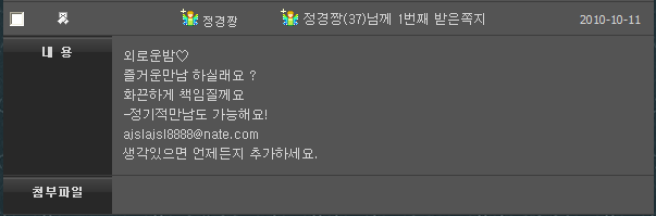 안녕하세요, 시간박물관 관리자입니다. 시간박물관을 이용하여 사기 행각을 벌인 회원을 활동 제재하였습니다. [닉네임] 정경짱 ![]() - 휴대폰번호 : 010 - 4153 - 9655 / 기타 번호 : 070 7078 4958 - 이메일 : ajslajsl8888@nate.com - 내용 ![]() : 쪽지로 네이트 메신져 ajslajsl8888@nate.com 로 친구등록을 유도한 후, 선입금 해달라고 함 선입금한 계좌번호 - 신한은행 110-30-4761-295 / 박향임 - 정경짱 IP 조회 결과 : [이픈히] 닉네임도 사용중 ![]() -> 휴대폰번호 : 010 - 6586 - 8661 - >이메일 : dlvmsgl1818@nate.com 시간박물관 회원님들께서는 서비스 이용시 선입금을 요구, 또는 입금하지 말아주시길 꼭 당부의 말씀 드립니다. 감사합니다. |